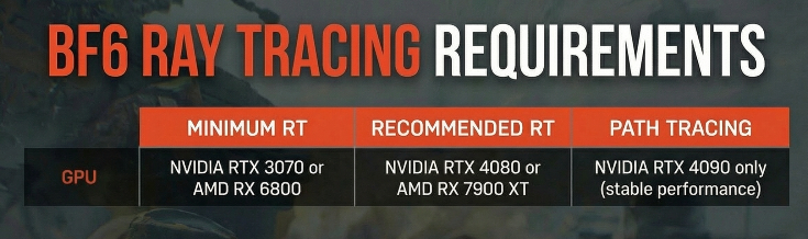 Battlefield 6 supports full ray tracing for reflections, shadows, and ambient occlusion. It is optional but makes the game look drastically better.