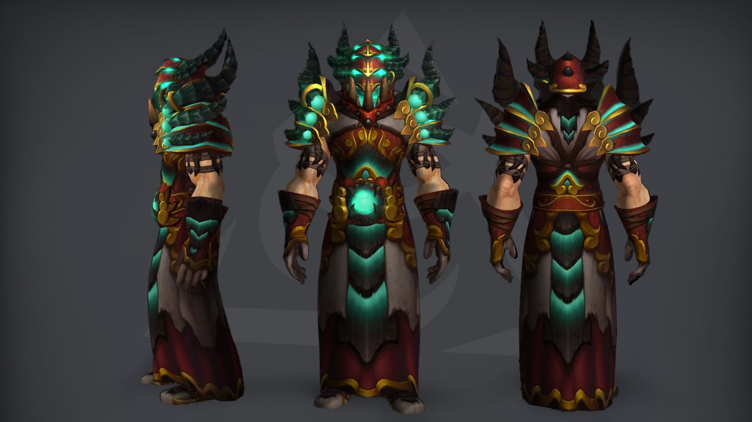 Helmet/Crown: Identical to the Heroic/Normal version, featuring multiple horns and intricate detailing with green glowing elements and golden embellishments.