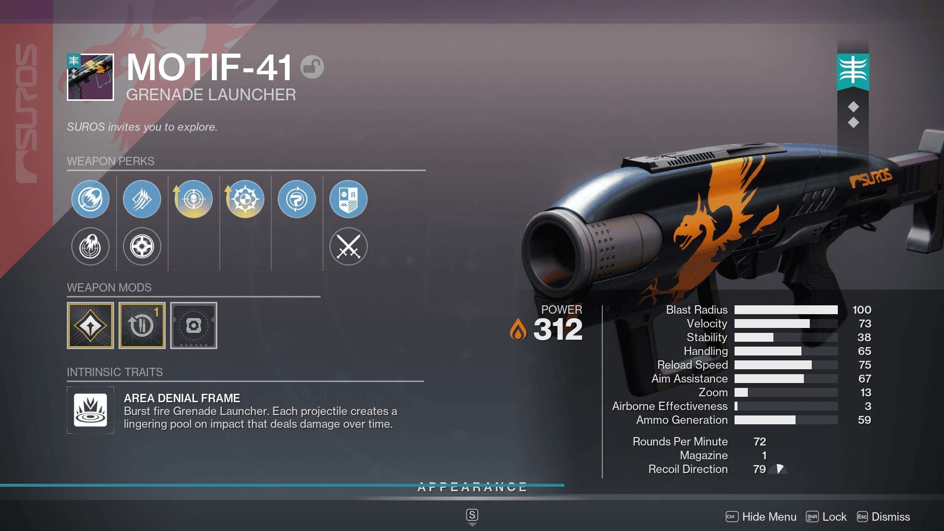 | Is this weapon good? | Motif-41 is a strong PvE utility Grenade Launcher. The lingering pool damage helps control space and clear enemies without constant reloading. |