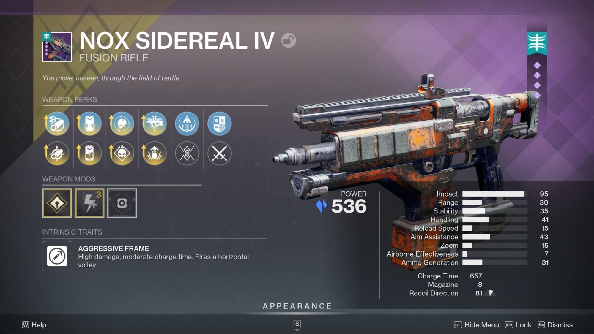 Nox Sidereal IV is a Legendary Kinetic Fusion Rifle introduced in Season 28. It deals Stasis damage and uses Special ammo. This weapon has random rolls and cannot be reclaimed from Collections.