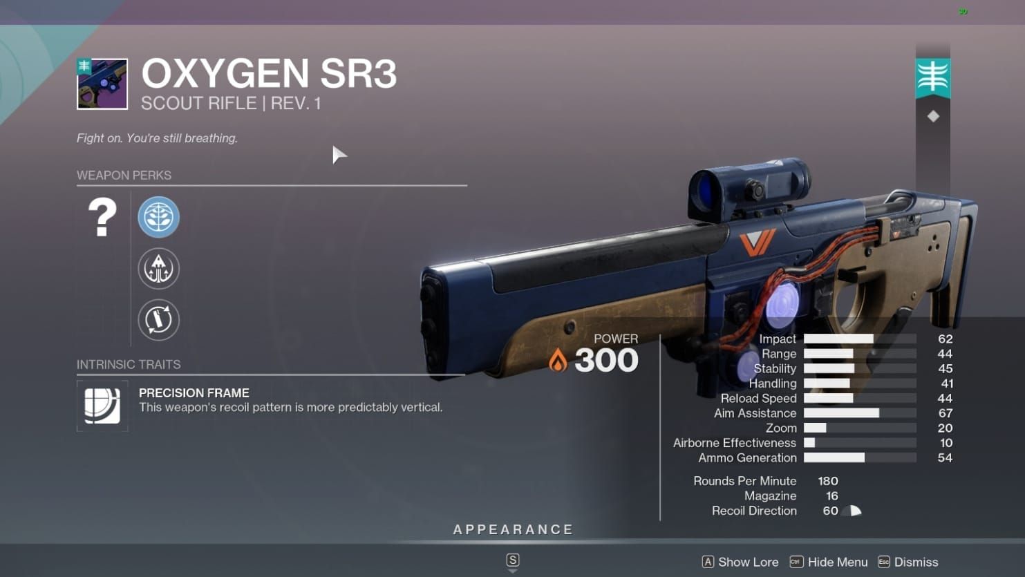 | Is this weapon good? | Oxygen SR3 is a strong PvE scout rifle. It works well for safe mid-range fights and becomes even better with perk combinations built around damage and healing. |