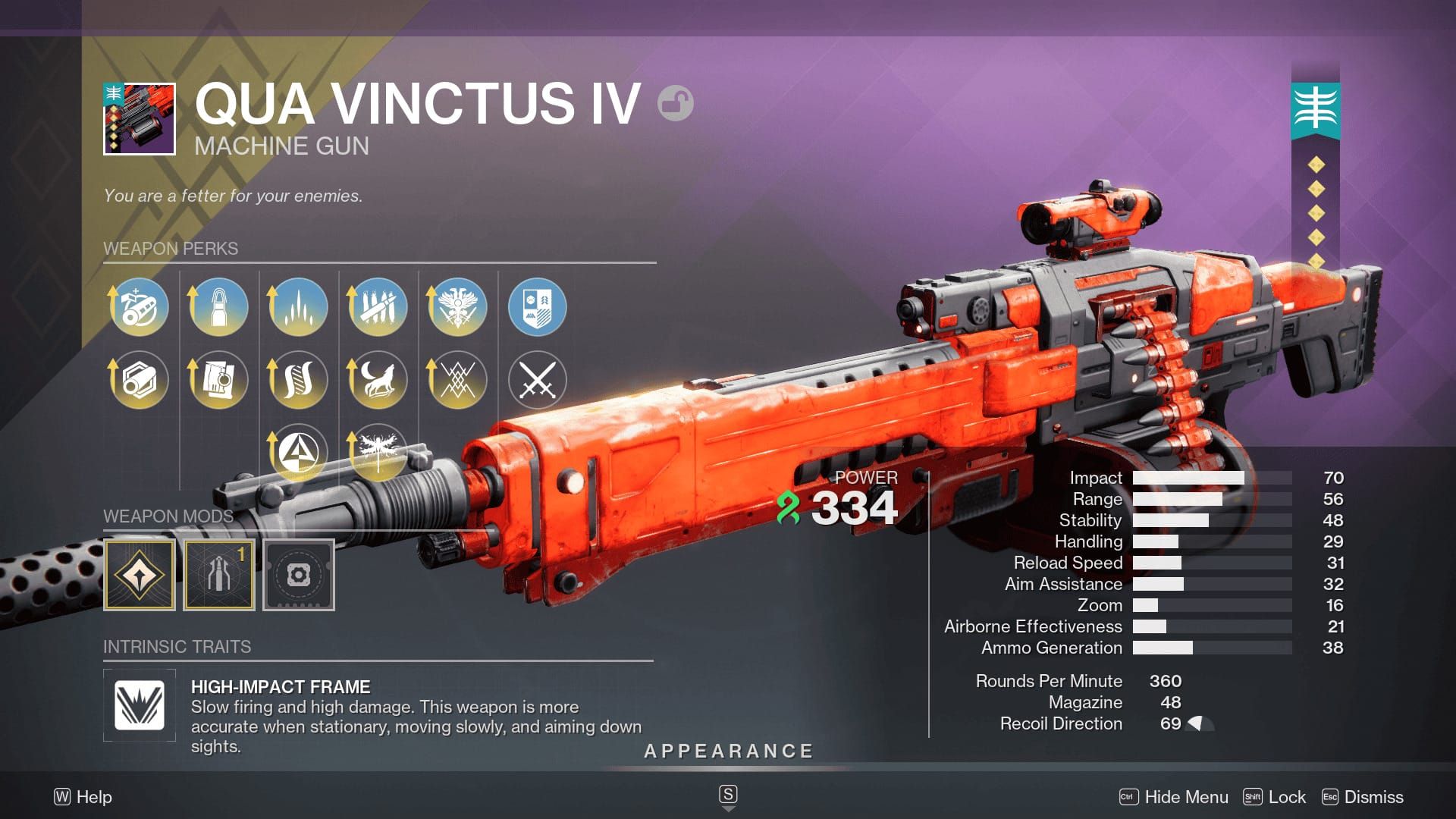 Qua Vinctus IV is a Legendary Machine Gun introduced in Season 28. It deals Strand damage, uses Heavy ammo, and is placed in the Power weapon slot. This weapon has random rolls and cannot be reclaimed from Collections.