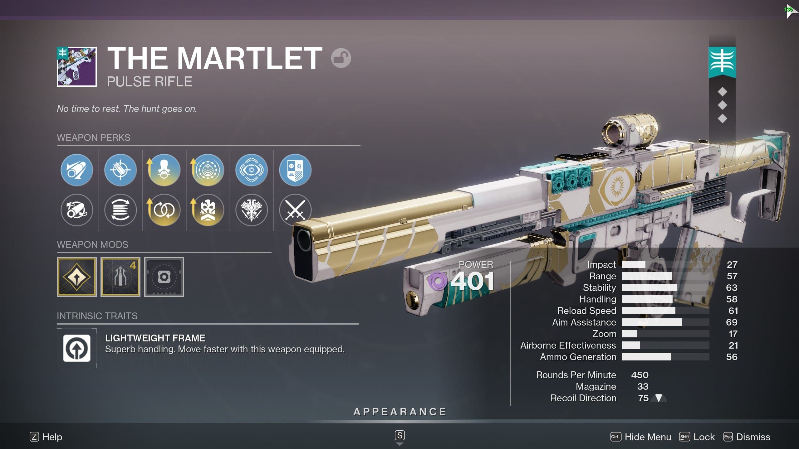 | Is this weapon good? | The Martlet is an elite Pulse Rifle. Its Lightweight archetype makes you move faster, and its high Aim Assist (69) combined with perks like Headseeker makes it incredibly forgiving and lethal in the Crucible. |