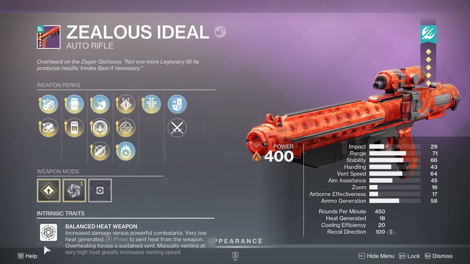 | How to get: | Zealous Ideal is a legendary Solar Auto Rifle that drops from encounters in the Equilibrium Dungeon. It is fully farmable, allowing repeated runs to chase better rolls. |